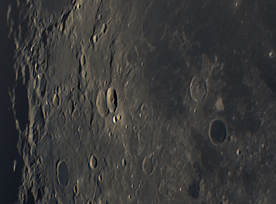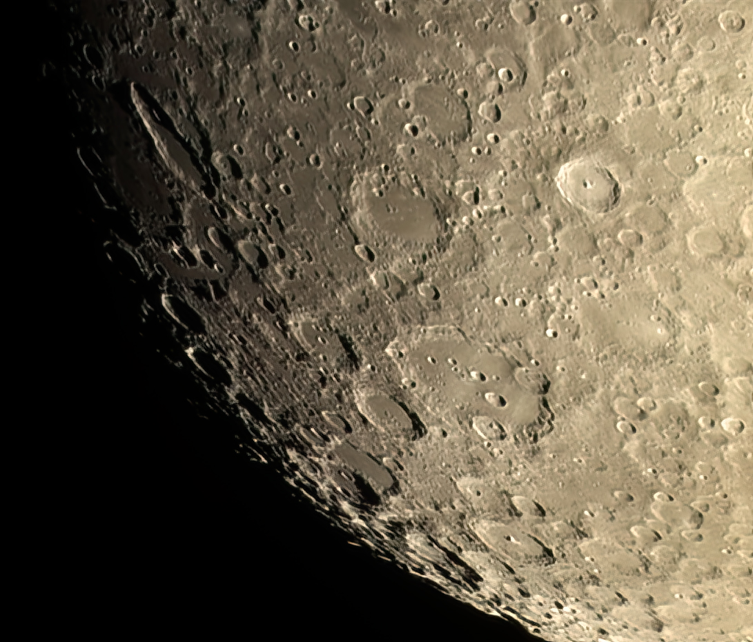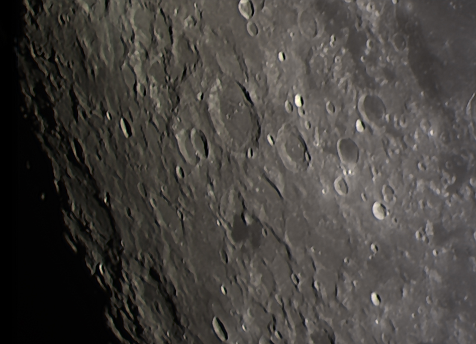 300 of 1000 frames, stacked using AutoStakkert, processed using Van-Cittert Deconvolution in AstroSurface. Further processing using Photoshop CS3 and Topaz DenoiseAi. Showing Petavius (top) and Langrenus (right).