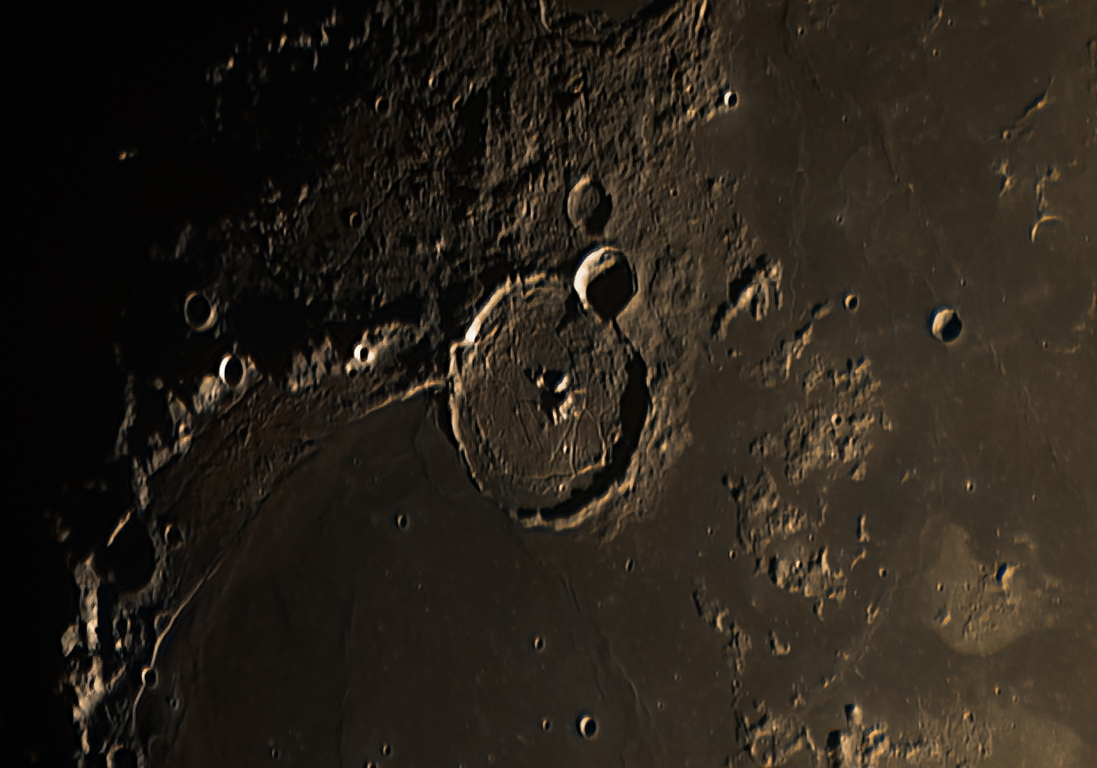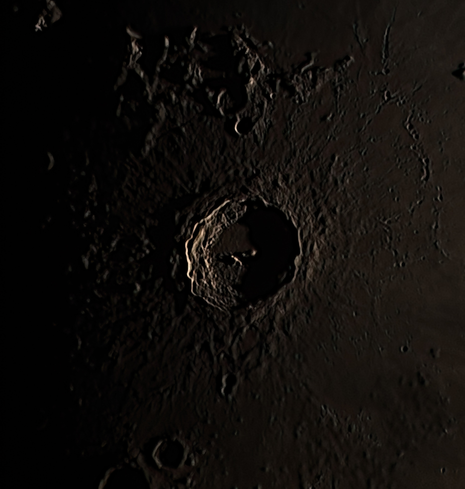 500 of 2000 frames, stacked and processed using Wavelets in AstroSurface. Further processing using Photoshop CS3 and Topaz DenoiseAi. Shows the crater Copernicus.