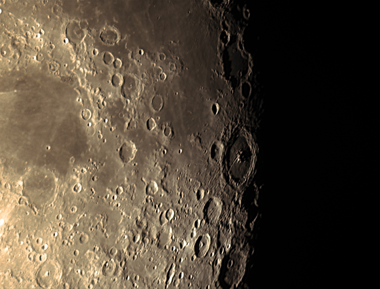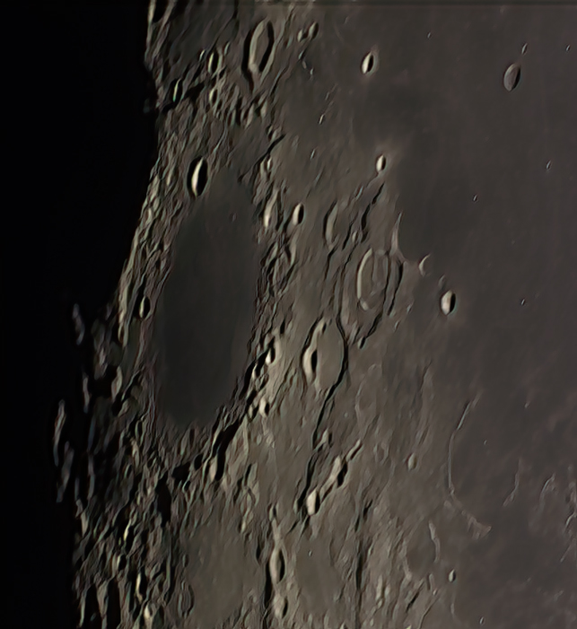 is 125 of 500 frames, stacked and processed using Wavelets in AstroSurface. Further processing using Photoshop CS3 and Topaz DenoiseAi. Shows a wide angle view of the entire terminator on the night.