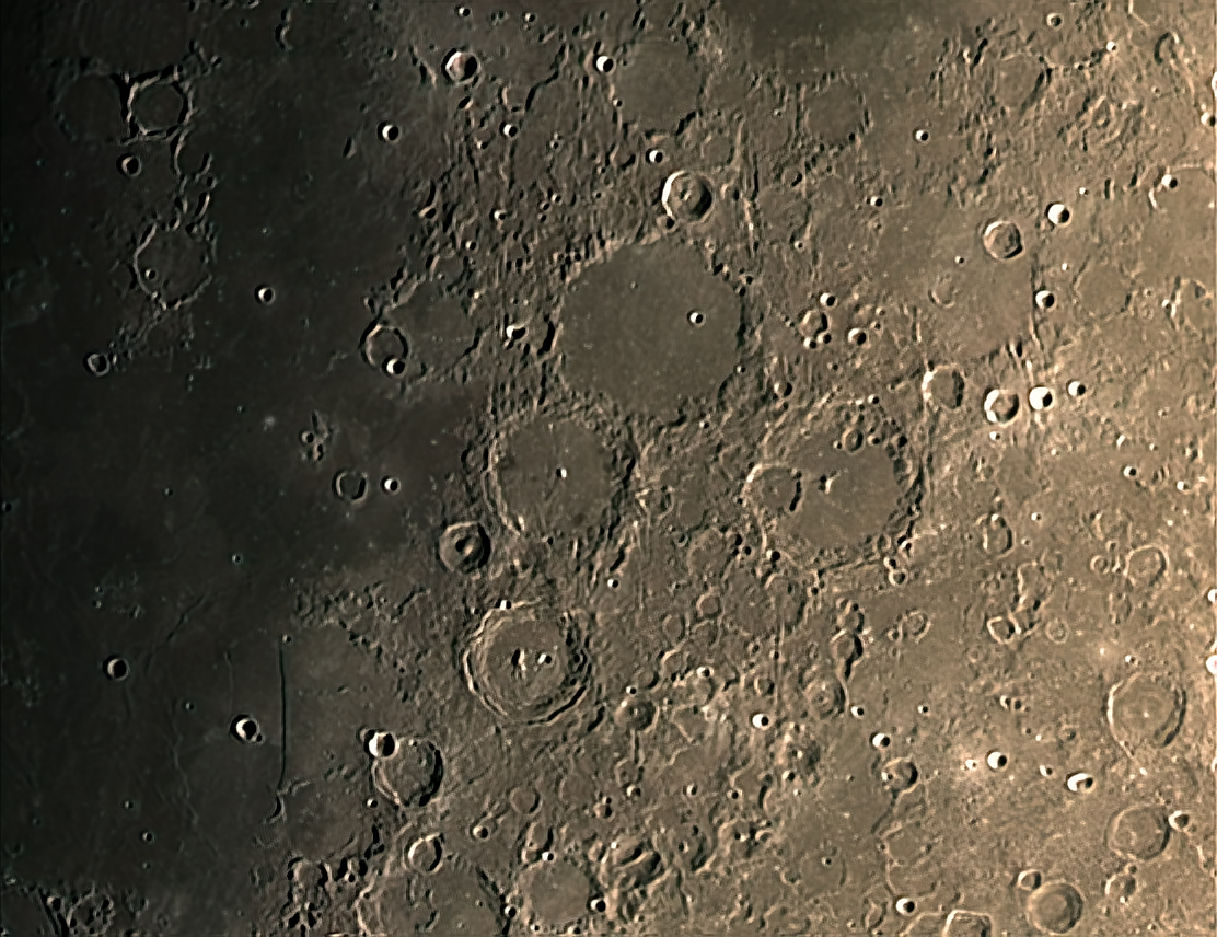 About 250 of 1000 frames, stacked and processed using Wavelets in AstroSurface. Further processing using Photoshop CS3 and Topaz DenoiseAi. Shows a wide angle view of Ptolemaeus, Alphonsus and Arzachel. Also note the straight wall at lower left.